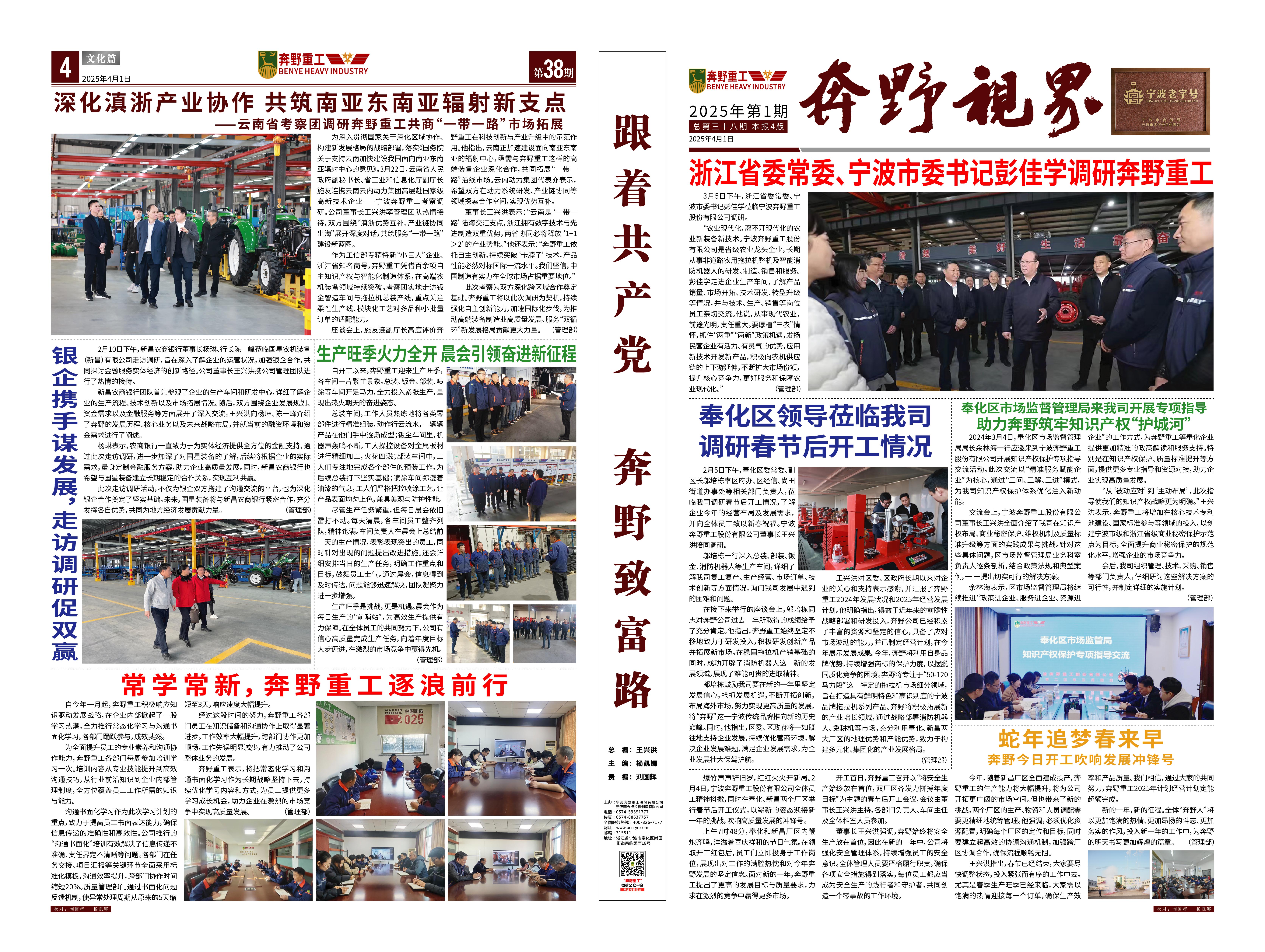 是一家非道路用農(nóng)用拖拉機(jī)整機(jī)及部件設(shè)備研發(fā)、制造、銷售、服務(wù)為一體的涉農(nóng)科研型生產(chǎn)企業(yè),專業(yè)生產(chǎn)寧波型奔野系列拖拉機(jī),是國家高新技術(shù)企業(yè)、工信部專精特新“小巨人”企業(yè)、浙江省知名商號(hào),寧波市級(jí)農(nóng)業(yè)龍頭企業(yè)、脫貧攻堅(jiān)-產(chǎn)業(yè)合作樣板企業(yè)、鄉(xiāng)村振興先進(jìn)集體,在寧波、新昌、吉林等地均設(shè)有生產(chǎn)基地,占地150多畝。公司現(xiàn)有技術(shù)骨干30多人,零部件自制化水平達(dá)到30%以上。公司目前擁有發(fā)明專利10余項(xiàng),實(shí)用新型專利、外觀專利、版權(quán)近50項(xiàng),擁有自主的知識(shí)產(chǎn)權(quán)保護(hù)品牌。公司所處的農(nóng)業(yè)農(nóng)機(jī)領(lǐng)域是國家重點(diǎn)關(guān)注和保障的、關(guān)乎國計(jì)民生的領(lǐng)域,得到國家和地方政府的大力支持,行業(yè)發(fā)展勢(shì)頭良好。